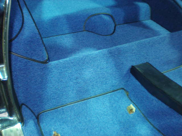 たいへん古く、貴重なお車。 フロアーのジュータンが色褪せ、ブルーが紺色や紫に変色していました。 全て取り除き、スクレーパーでのりを除去し、型を起こしました。 ジュータン輪郭部はヘリをとり、直に接着せずに、防音効果のあるフエルトをあつらえました。これで鮮やかなブルーが戻ってきましたね。